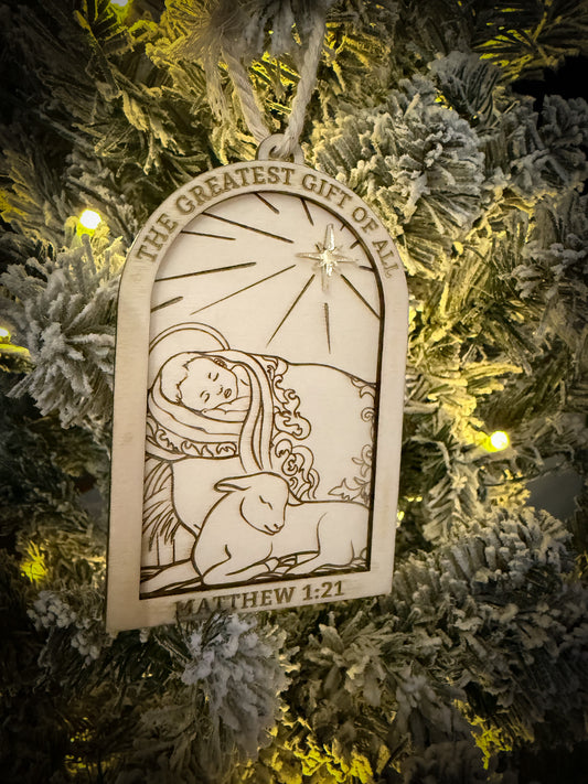 The Greatest Gift of Allā Nativity Ornament ā Laser Cut Wooden Christmas Keepsake with Story Card | Faith-Based Holiday DĆ©cor
