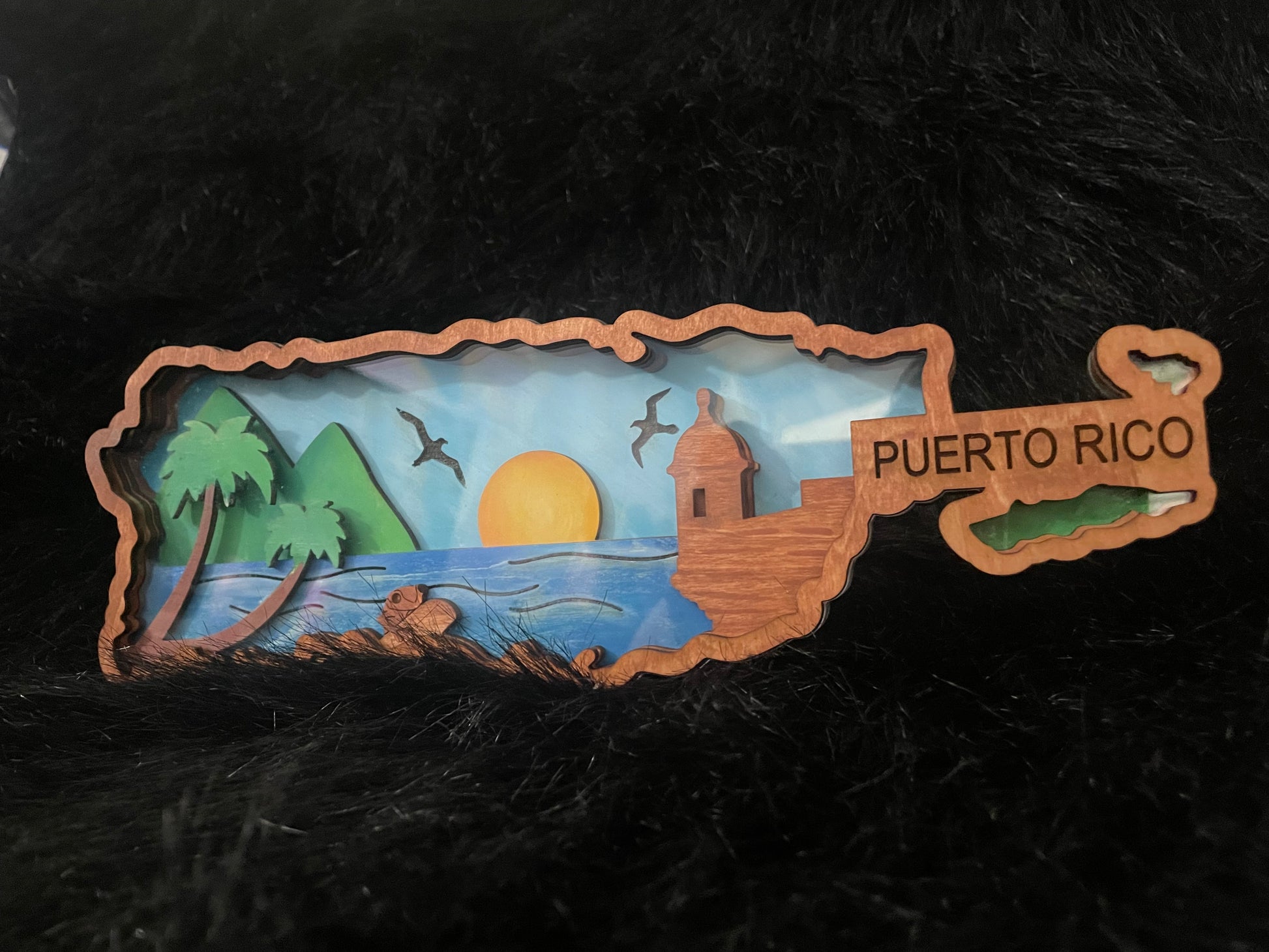 Mapa 3D de Puerto Rico en Madera y Acrylic o pintado a mano. Mide aproximadamente 11.9 pulgadas de ancho y 3.5 de alto.